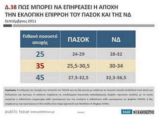 Στο βαρόμετρο της Public Issue του Σεπτεμβρίου 2011 για τον Σκάι και την Καθημερινή υπάρχει η κάρτα Δ.38 η οποία δείχνει πως όσο ανεβαίνει η αποχή τόσο ανεβαίνουν και τα ποσοστά των δύο μεγάλων κομμάτων, ΠΑΣΟΚ και ΝΔ.