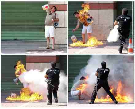 (Στη φωτογραφία, ο 55χρονος άνδρας που επιχείρησε να αυτοπυρποληθεί στη Θεσσαλονίκη, έξω από υποκατάστημα της Τράπεζας Πειραιώς. Περιέργως, το όνομα της Τράπεζας Πειραιώς λείπει από τα ρεπορτάζ των καθεστωτικών μέσων που μετέδωσαν την είδηση – μη χάσουν τη διαφήμιση. Κι όμως, αυτή θα έπρεπε να είναι η επόμενη διαφημιστική καμπάνια της Τράπεζας Πειραιώς. «Οι πελάτες μας καίγονται για εμάς«.)