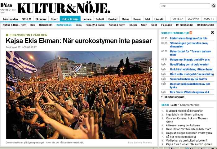 Η Kajsa Ekis Ekman ήρθε το καλοκαίρι στην Ελλάδα και μόλις επέστρεψε στη Σουηδία, δεν έχασε χρόνο. Έκατσε κι έγραψε σε ένα άρθρο όλη την εμπειρία της, από μια Ελλάδα που περνάει τις πιο δύσκολες μεταπολεμικές στιγμές της. Το κείμενό της, δημοσιεύτηκε στις 8 Αυγούστου, στην εφημερίδα Dagens Nyheter.