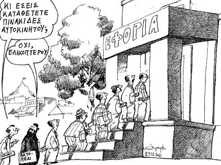 Αυτές τις μέρες στις Εφορίες σχηματίζεται ένα μακρύ ανθρώπινο κομποσκοίνι που φτιάχνεται το χάραμα και σπάει το μεσημέρι. Κάθε κόμπος έχει και μία διαφορετική ιστορία φορολογικού πόνου να διηγηθεί. Άλλος πάει να καταθέσει πινακίδες και άλλος καμιά καλή δικαιολογία για παλιές αμαρτίες που δεν εξομολογήθηκαν. Τέλος πάντων, αυτές τις μέρες δεν θέλεις να είσαι στην Εφορία, εκτός και αν είσαι ο καφετζής από δίπλα.