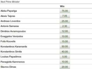 Ο Τσίπρας πληρώνει λιγότερο από τον Βενιζέλο, δηλαδή του δίνουν περισσότερες πιθανότητες να μπει στο Μαξίμου. Ο Αλέξης δίνει 7.5 ευρώ για κάθε ένα που στοιχηματίζεται, ενώ ο Βενιζέλος αποδίδει όσο και ο Καμμένος: αν ένας εξ αυτών μπει στο Μαξίμου η απόδοση ειναι 10. Βάζεις ένα κατοστάρικο, παίρνεις χιλιάρικο. Και αν η απόδοση του Τσίπρα φαίνεται χαμηλή, θυμηθείτε ότι έτσι και γίνει πρωθυπουργός το οικονομικό όφελος θα είναι μεγαλύτερο, θα μας απαλλάξει από το μνημόνιο, συνεπώς χαλάλι το μικρό κέρδος. Βέβαια ο «άρρωστος» θα παίξει κάτι σε Αβραμόπουλο. Ο εντελώς κατεστραμένος θα βάλει τα λεφτά του σε Κώστα Καραμανλή. Ο απελπισμένος θα επενδύσει σε Παπαρήγα. Και ο πονηρός θα πάρει τηλέφωνο στο ραδιόφωνο για να πει ότι δεν είναι τυχαία η επιστροφή του Μάκη Ψωμιάδη.