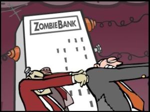 Το πρόβλημα με τις τράπεζες-ζόμπι είναι ότι όση ρευστότητα και να τις ταίσεις δεν πρόκειται να δανείσουν ένα σοβαρό ποσοστό αυτών των χρημάτων στον ιδιωτικό τομέα, με αποτέλεσμα το βάθεμα της Ύφεσης. Αυτό το γνώριζε η Κεντρική Τράπεζα την Ιαπωνίας. Αλλά τι επιλογή είχε (δεδομένου ότι το πολιτικό σύστημα δεν της επέτρεπε να βάλει το μαχαίρι στο κόκκαλο των τραπεζών); Αν δεν τις «τάιζε», αγοράζοντας όλο και περισσότερους από τους απαξιωμένους χάρτινους τίτλους της, με όλο και μεγαλύτερους πακτωλούς δημόσιου χρήματος, θα κατέρρεαν αμέσως.